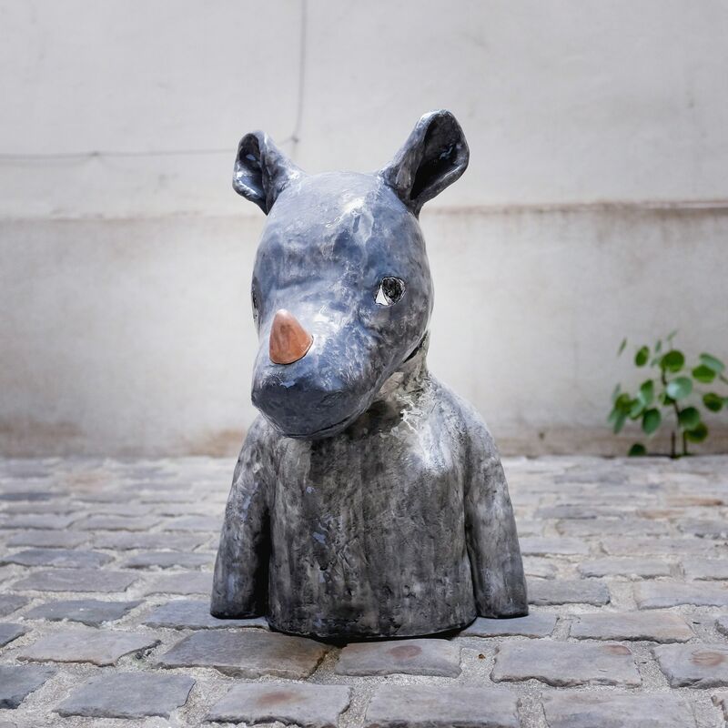Rhinoceros Bust – 53 x 34 x 32 cm – glazed ceramic and copper